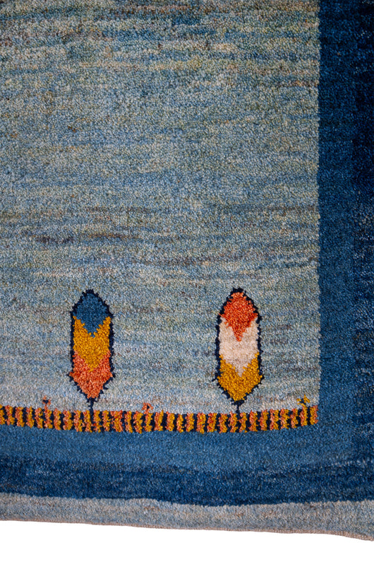 Many shades of blue set the background for these three geometric tree-of-life patterns. This gabbeh is a collector's dream find!
