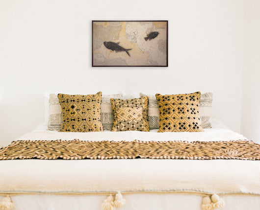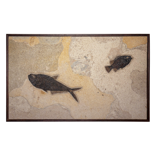 Quarried from the 'Fossil Lake' stone layer, this collector sized framed mural features a 5” Cockerellites liops and a 10” Diplomystus dentatus. The fossilized fish are presented in the naturally occurring and gorgeously textured limestone matrix, and set within a dark wood frame, ready for your wall.