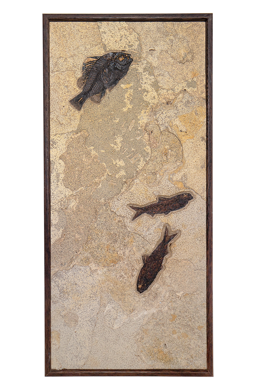 Quarried from the 'Fossil Lake' stone layer, this collector sized framed mural features a 4” and a 4-3/4” Knightia eocaena, and a 5” Cockerellites liops. The fossilized fish are presented in the naturally occurring and gorgeously textured limestone matrix, set within a dark wood frame, ready for your wall. These rare fossils are an incredible record of the earth's history.