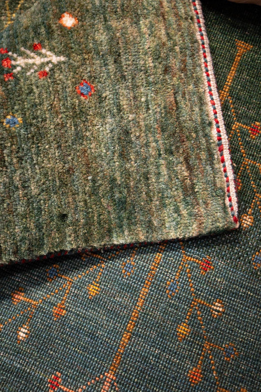 This lyrical runner features a delicate tree-of-life motif that rises gently through a field of layered blue-green tones, accented with tiny, jewel-like blossoms in soft coral, ivory, and muted gold. The background shifts subtly from sea-washed blue to moss and sage, creating a quiet sense of depth and movement along the length of the rug. Organic and refined, this piece feels equally at home in a serene hallway, a bedroom, or a thoughtfully composed modern interior.