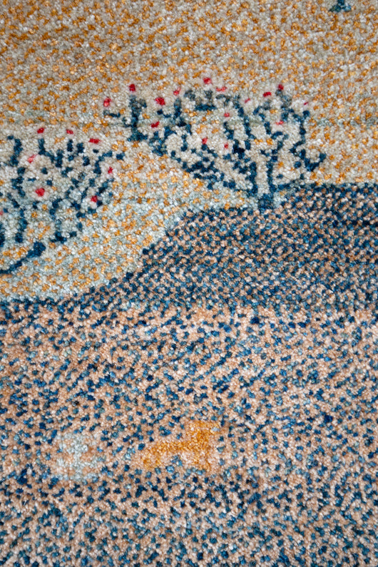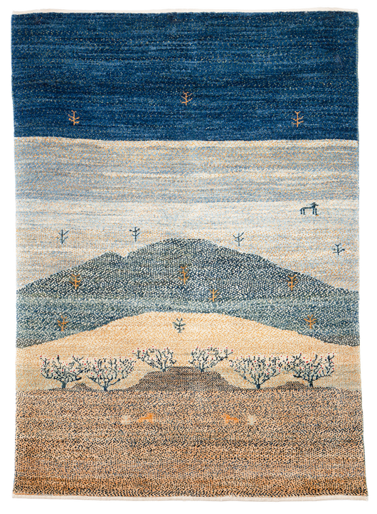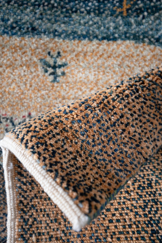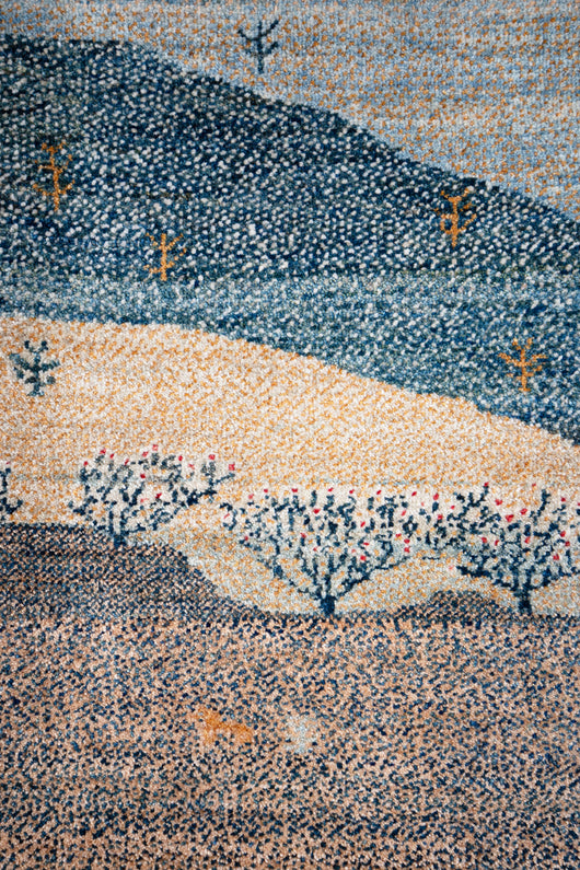 This enchanting piece is a window into a dreamlike world. Woven with shades of rich indigo, soft sky blues, and sandy earth tones, it depicts a peaceful landscape of trees, roaming animals, and timeless tribal motifs. The design feels both ancient and alive, carrying the quiet rhythm of village life and the beauty of nature into your home. Serene and full of character, this petite treasure is a joy to behold and a delight to collect.